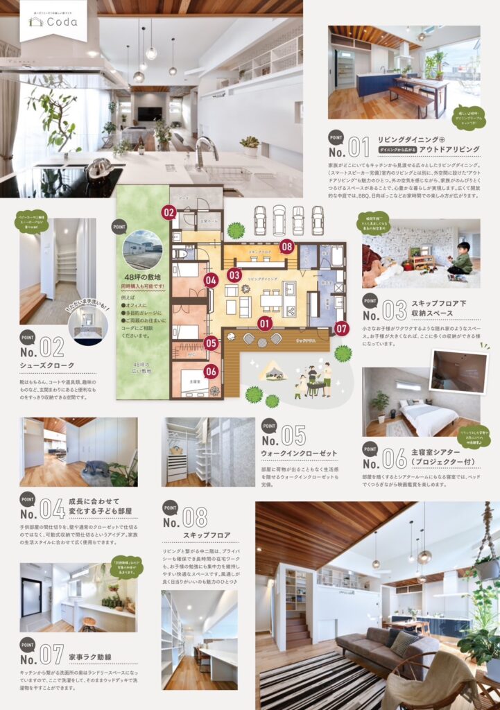 家族がどこにいてもキッチンから見渡せる広々としたリビングダイニング。(スマートスピーカー完備)室内のリビングとは別に、外空間に設けた"アウトドアリビングも魅力のひとつ。外の空気を感じながら、家族がのんびりとくつろげるスペースがあることで、心豊かな暮らしが実現します。広くて開放的な中庭では、BBQ、日向ぼっこなどお家時間での楽しみ方が広がります。