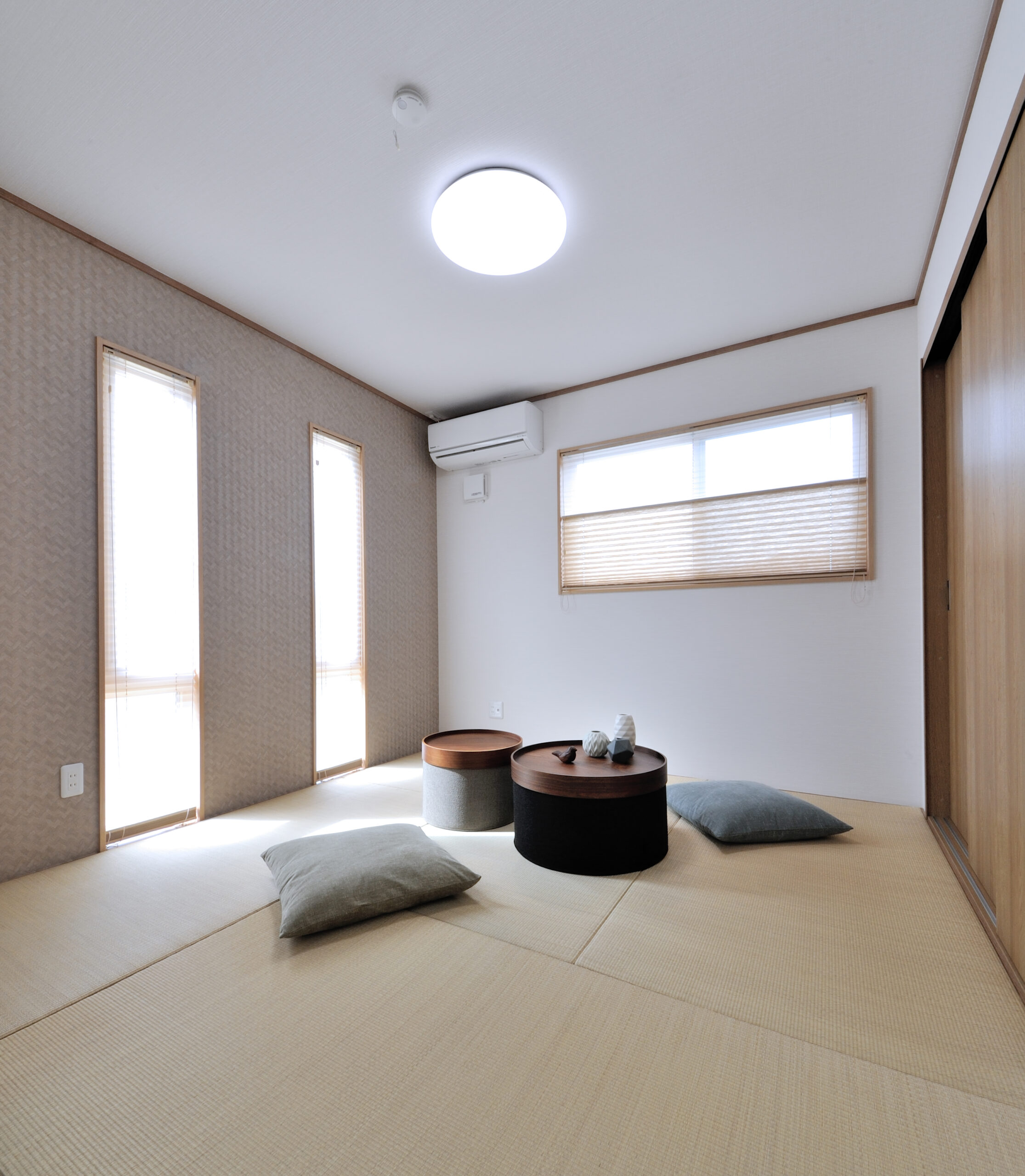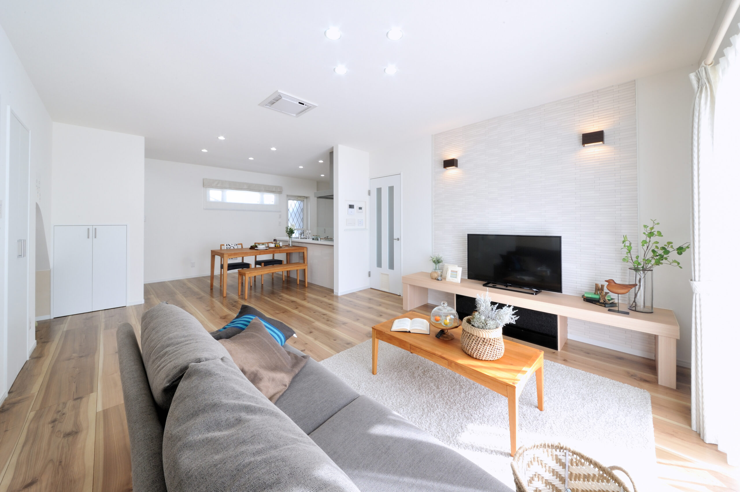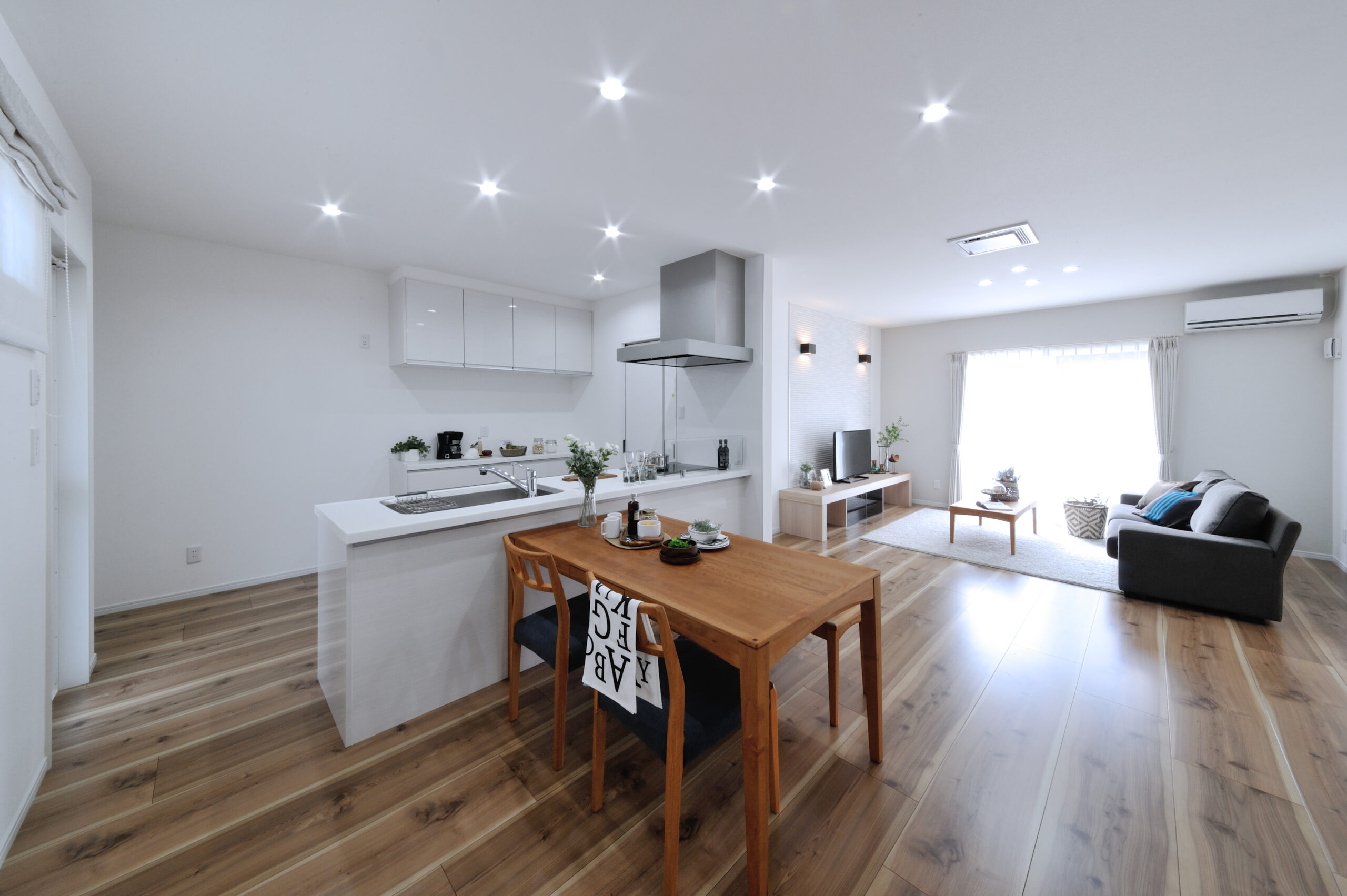 白を基調に、木目が印象的なフロアーやフルフラットキッチンが映えるシンプルな装い。