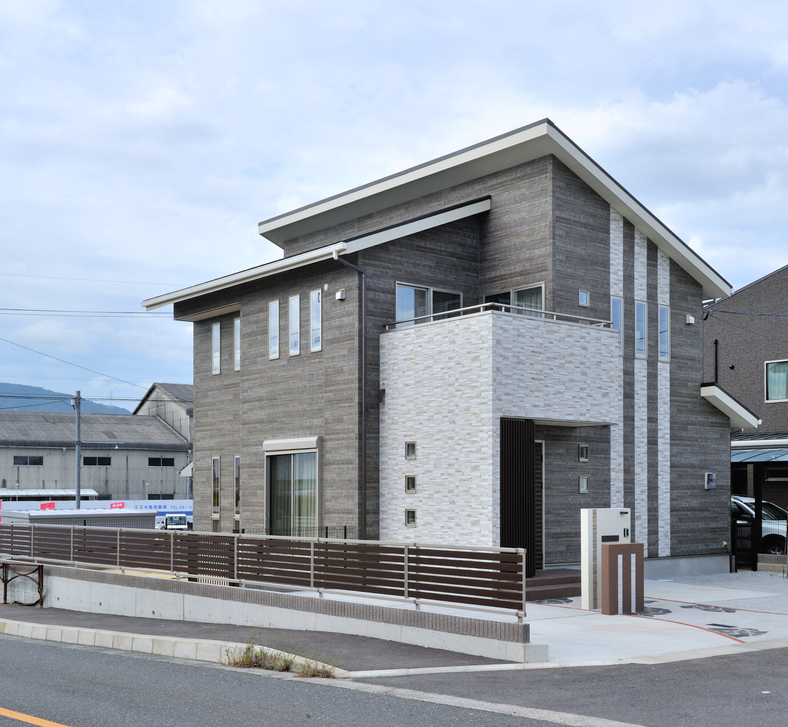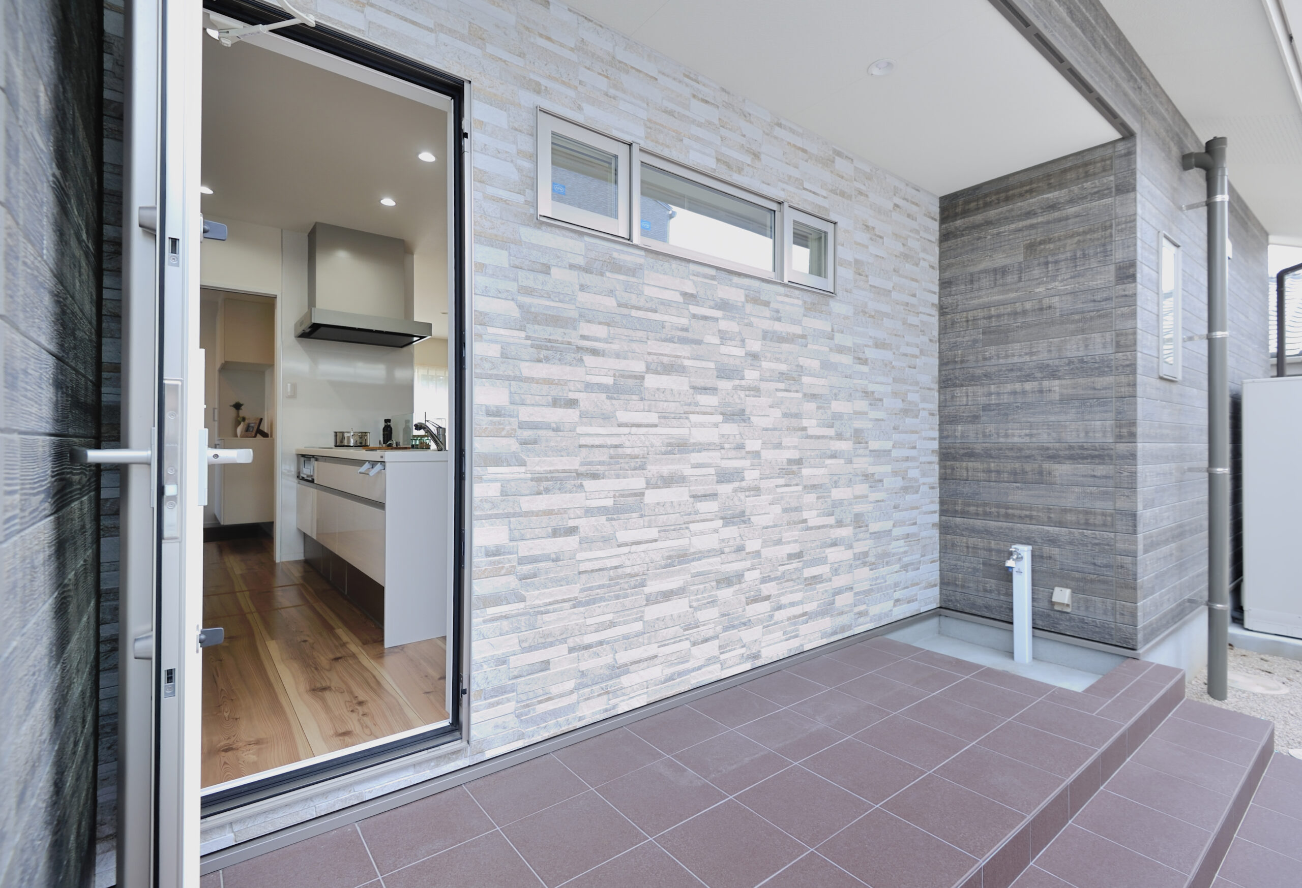 玄関に寄り添う目隠し格子がブラウン色の落ち着いた配色でアクセントを加えている。