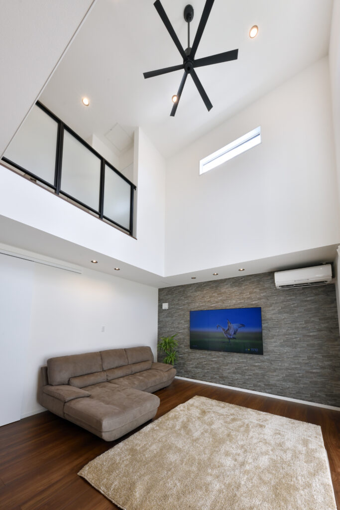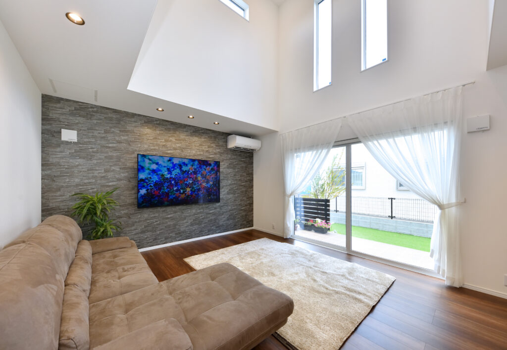 大きな吹き抜けがあり、明るく広々としたリビング。